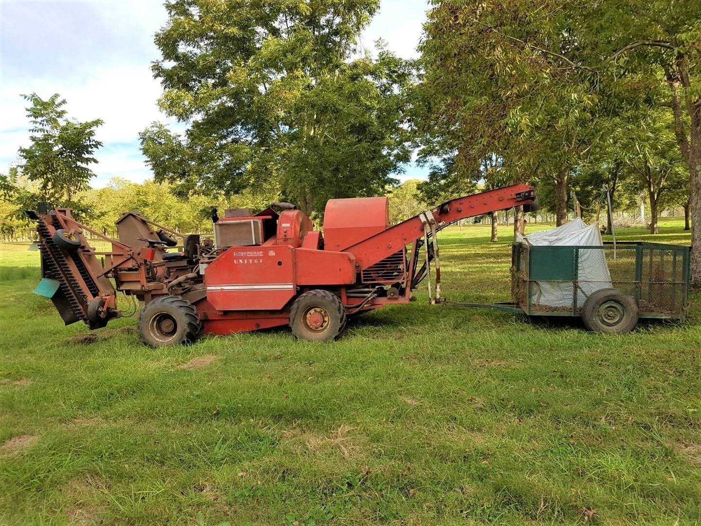 Harvesting Equipment - Flory Harvester, New Holland Tractor, Weiss McNair Sweeper, Taarup Disc Mower, Tree Shaker, Four Field Bins and Fan, a Toyota and Daihatsu Farm Trucks