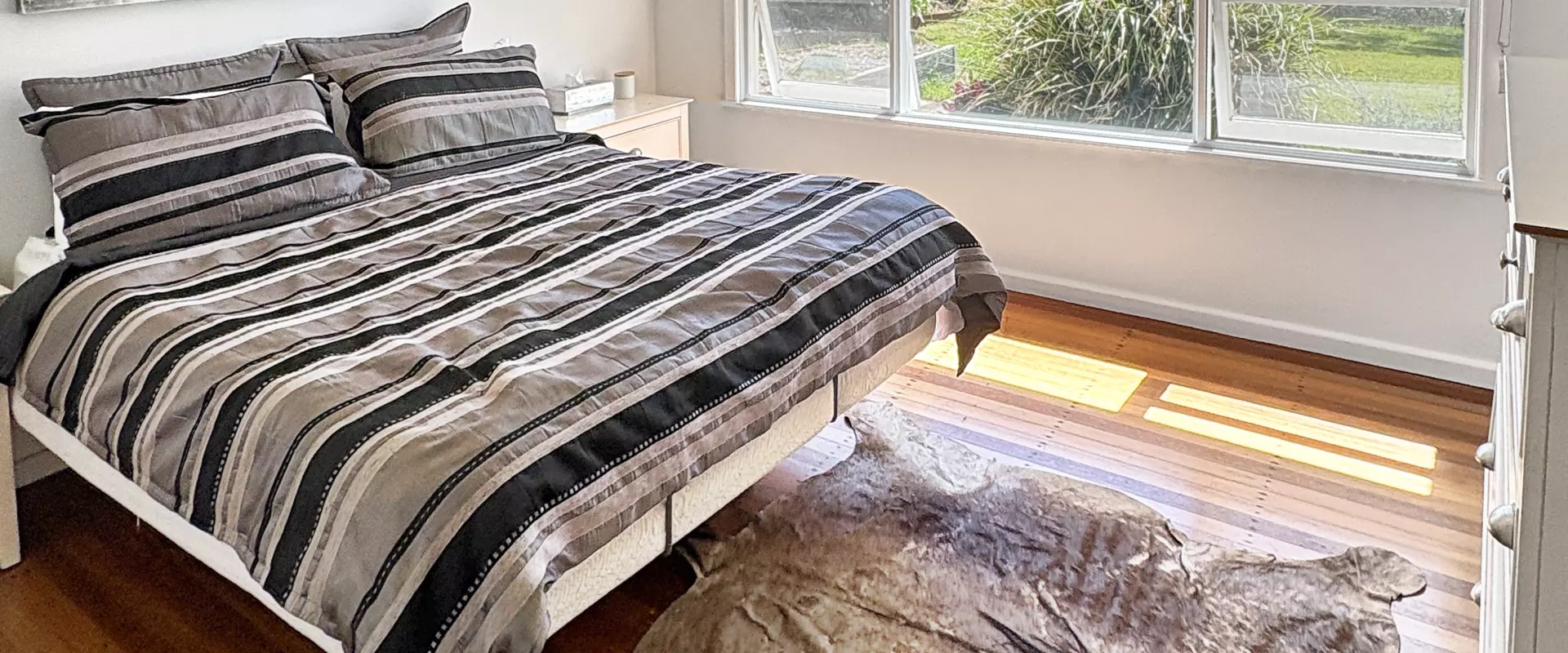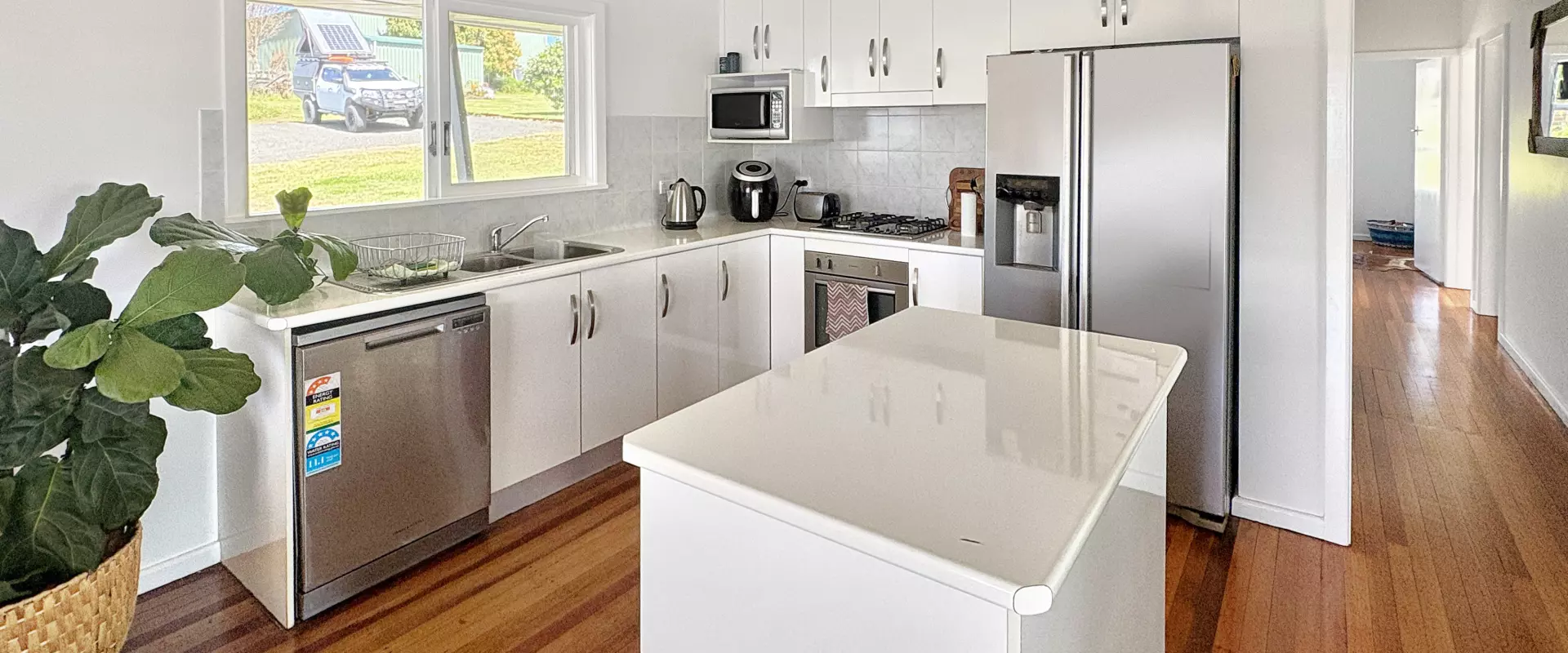The kitchen is the true heart of the home, boasting a gas cooktop, ample storage including an island bench, and a dishwasher for easy clean-up. As a bonus, the owner is happy to include the pictured fridge with a plumbed water dispenser.