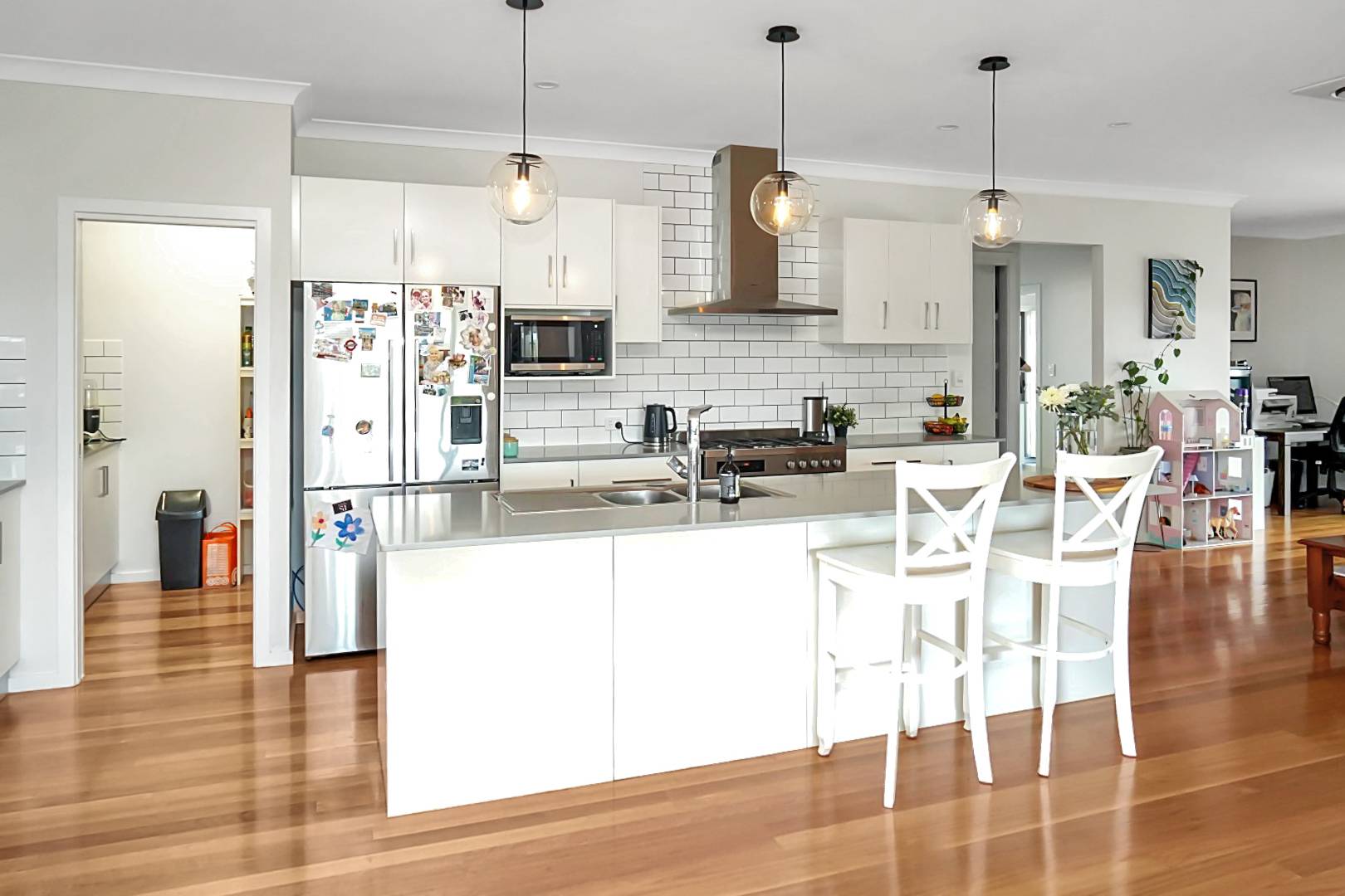 The heart of the home is an expansive open-plan living area that seamlessly connects the large lounge to a chef’s kitchen—perfect for entertaining or family gatherings. An internal staircase provides easy access between the two levels.