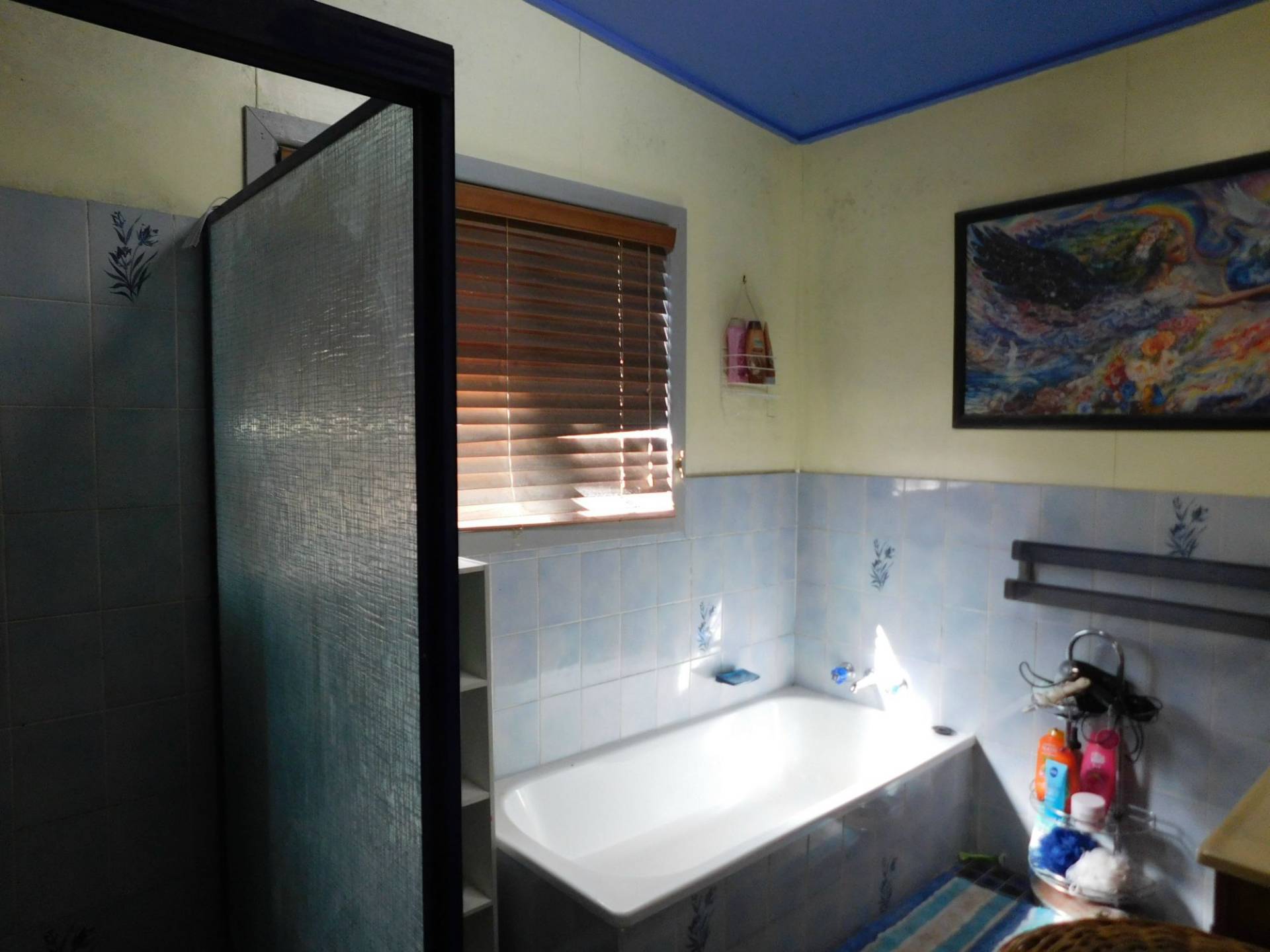 A bathroom with bath and shower plus a separate toilet. A back verandah