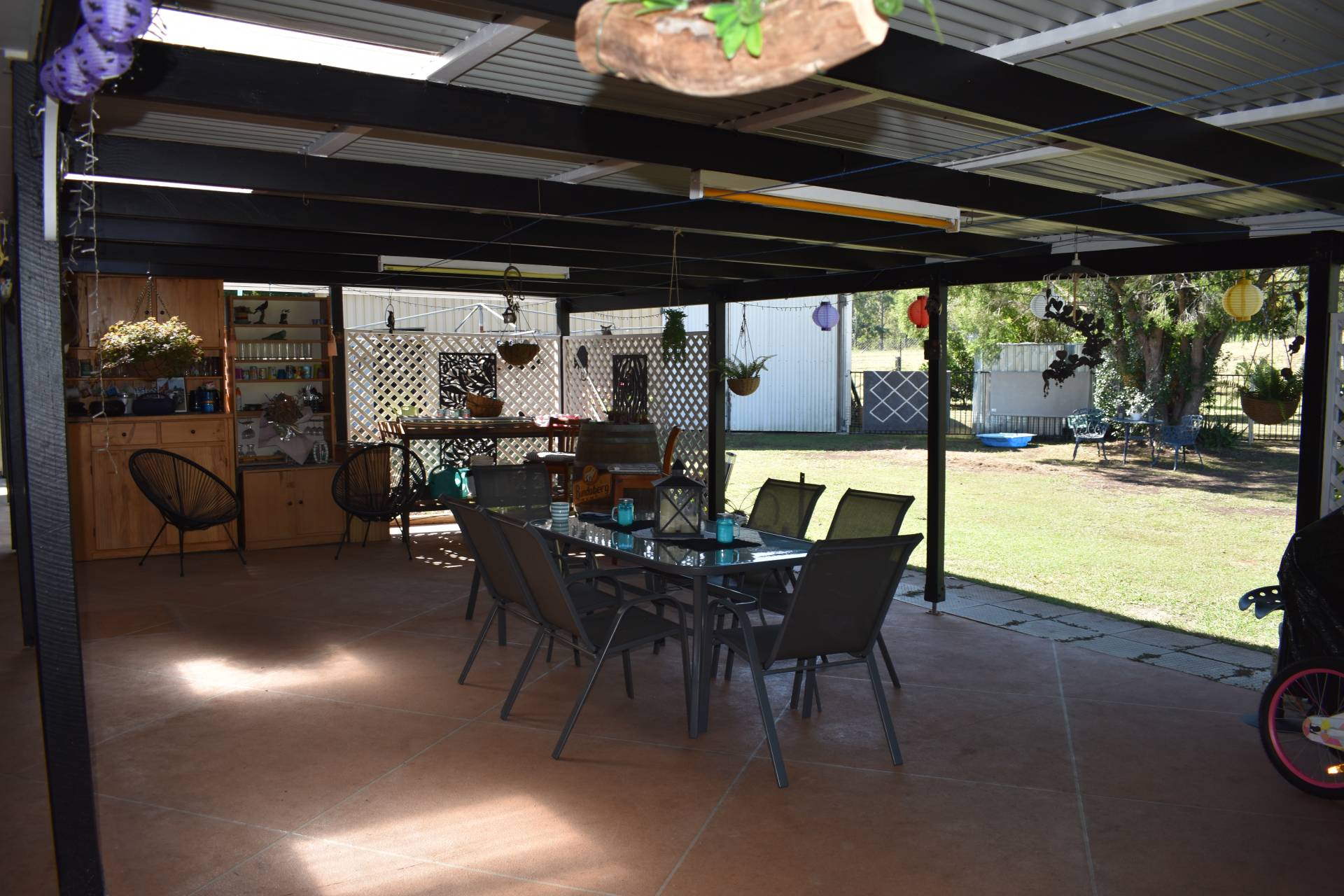 Outside we have a second toilet, an extra-large covered entertainment area that you will not turn down the opportunity to host BBQs and celebrations, plenty of room for cars, caravan, tractor and boat or to keep up with your hobbies with a large double garage both with electric roller doors and workshop. Water is not a problem with tanks and a bore in place, especially to keep the picturesque gardens and fruit trees on point throughout the year.